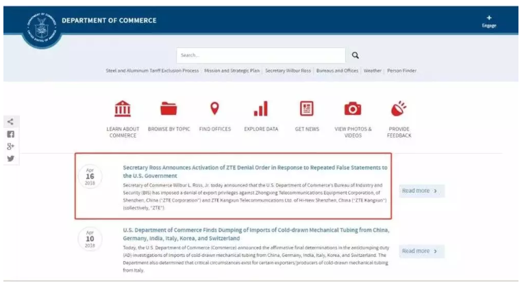 4月16日晚,美国商务部宣布,因为违反美国规定,美国企业被禁在未来七年内向中国电信设备制造商中兴通讯出售零部件、商品、软件和技术。美国商务部官员表示,根据之前协议,中兴通讯承诺解雇4名高级雇员,并通过减少奖金或处罚等方式处罚35名员工。但中兴通讯没有遵守协议。